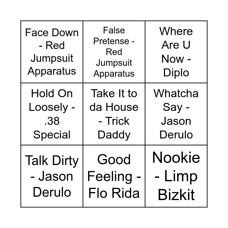 This bingo card has 20 words: One Last Breath - Creed, Caught Up in You - .38 Special, Where Are U Now - Diplo, Senorita - Camila Cabello, Want to Want Me - Jason Derulo, Take It to da House - Trick Daddy, Denial Is A River - DOECHII, Face Down - Red Jumpsuit Apparatus, Nookie - Limp Bizkit, False Pretense - Red Jumpsuit Apparatus, Love Her Madly - The Doors, Thank U, Next - Ariana Grande, Whatcha Say - Jason Derulo, Hit the Road Jack - Ray Charles, Talk Dirty - Jason Derulo, Gone - *NSYNC, Good Feeling - Flo Rida, Hold On Loosely - .38 Special, H.O.L.Y. - Florida Georgia Line and I Want It That Way - Backstreet Boys.