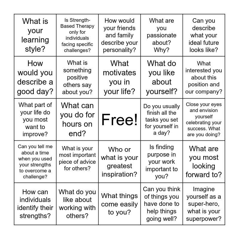 This bingo card has a free space and 34 words: What is working well?, Can you think of things you have done to help things going well?, What have you tried? And what has been helpful?, What skills or abilities are you most proud of?, Can you tell me about a time when you used your strengths to overcome a challenge?, What is something positive others say about you?, Can you describe what your ideal future looks like?, How can individuals identify their strengths?, Is Strength-Based Therapy only for individuals facing specific challenges?, What life accomplishments are you most proud of?, What motivates you in your life?, How would your friends and family describe your personality?, What is your greatest strength?, Do you think you have any weaknesses? What are they?, Do you usually finish all the tasks you set for yourself in a day?, What interested you about this position and our company?, What do you like about working with others?, What part of your life do you most want to improve?, What is your most important piece of advice for others?, Is finding purpose in your work important to you?, Who or what is your greatest inspiration?, What kind of tasks come most easily to you?, What is your learning style?, Close your eyes and envision yourself celebrating your success. What are you doing?, What things come easily to you?, Imagine yourself as a super-hero, what is your superpower?, What are you passionate about? Why?, What’s the last compliment you received? Why do you think they said that?, What do you like about yourself?, How would you describe a good day?, What fascinates you?, What can you do for hours on end?, What are you most looking forward to? and Who do you like spending time with? Why?.