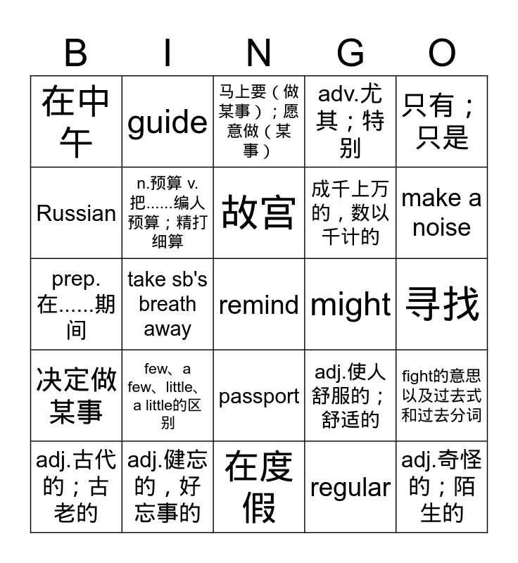 This bingo card has a free space and 24 words: adj.古代的;古老的, few、a few、little、a little的区别, 故宫, regular, 只有;只是, 在中午, guide, 马上要(做某事);愿意做(某事), might, 寻找, prep.在......期间, n.预算 v.把......编人预算;精打细算, adj.使人舒服的;舒适的, fight的意思以及过去式和过去分词, Russian, adj.健忘的,好忘事的, 在度假, adv.尤其;特别, make a noise, 决定做某事, take sb's breath away, passport, 成千上万的,数以千计的 and adj.奇怪的;陌生的.