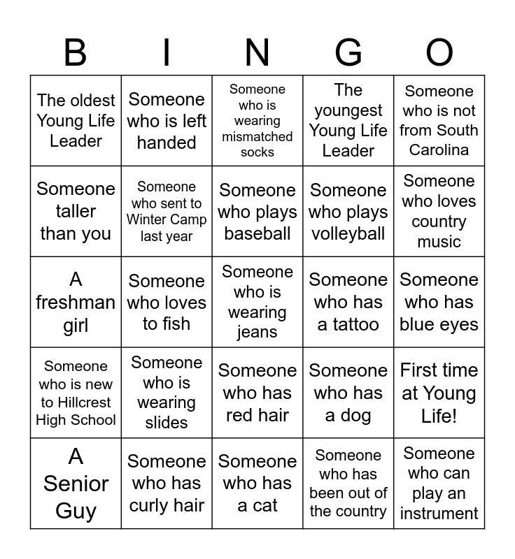 This bingo card has a free space and 24 words: Someone who is wearing slides, Someone who has curly hair, Someone who plays baseball, A Senior Guy, Someone who is not from South Carolina, The oldest Young Life Leader, Someone taller than you, Someone who is left handed, Someone who has a tattoo, Someone who has red hair, Someone who plays volleyball, A freshman girl, Someone who has a dog, First time at Young Life!, Someone who sent to Winter Camp last year, Someone who has been out of the country, Someone who has blue eyes, Someone who is wearing mismatched socks, Someone who loves country music, Someone who loves to fish, Someone who can play an instrument, Someone who is new to Hillcrest High School, The youngest Young Life Leader and Someone who has a cat.