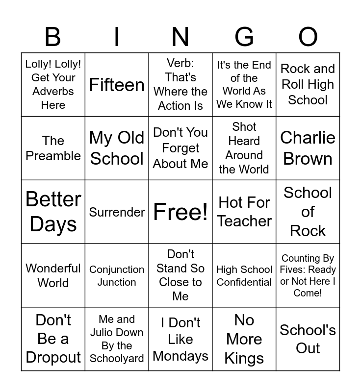This bingo card has a free space and 40 words: School Day, Better Days, Be True to Your School, My Old School, Me and Julio Down By the Schoolyard, Don't Stand So Close to Me, Don't You Forget About Me, ABC, Rock and Roll High School, Wonderful World, Surrender, It's the End of the World As We Know It, School's Out, School of Rock, Hot For Teacher, Conjunction Junction, Interjections!, Lolly! Lolly! Get Your Adverbs Here, Unpack Your Adjectives, Verb: That's Where the Action Is, Counting By Fives: Ready or Not Here I Come!, No More Kings, Shot Heard Around the World, The Preamble, Elbow Room, Mother Necessity, I'm Just a Bill, Three Is a Magic Number, Getting Better, What Did You Learn In School Today, We're Going to Be Friends, Don't Be a Dropout, Smokin' In the Boys Room, High School Confidential, Charlie Brown, I Don't Like Mondays, Pumped Up Kicks, Jeremy, Fifteen and Parents Just Don't Understand.