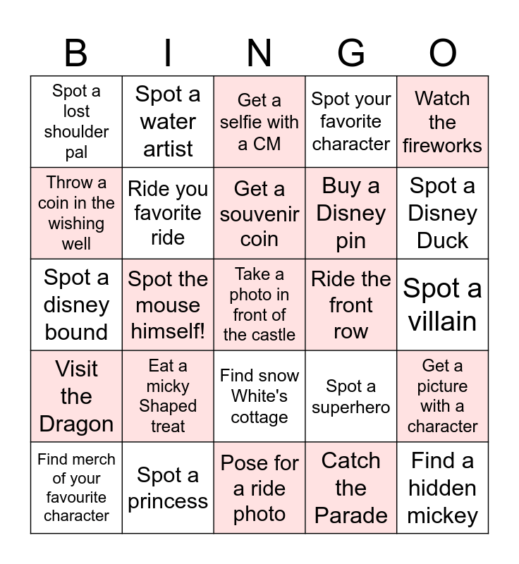 This bingo card has a free space and 24 words: Eat a micky Shaped treat, Spot a princess, Get a souvenir coin, Find merch of your favourite character, Watch the fireworks, Spot a lost shoulder pal, Throw a coin in the wishing well, Spot a water artist, Ride the front row, Find snow White's cottage, Buy a Disney pin, Spot a disney bound, Spot a superhero, Get a picture with a character, Ride you favorite ride, Catch the Parade, Spot a villain, Get a selfie with a CM, Spot a Disney Duck, Spot the mouse himself!, Find a hidden mickey, Visit the Dragon, Spot your favorite character and Pose for a ride photo.
