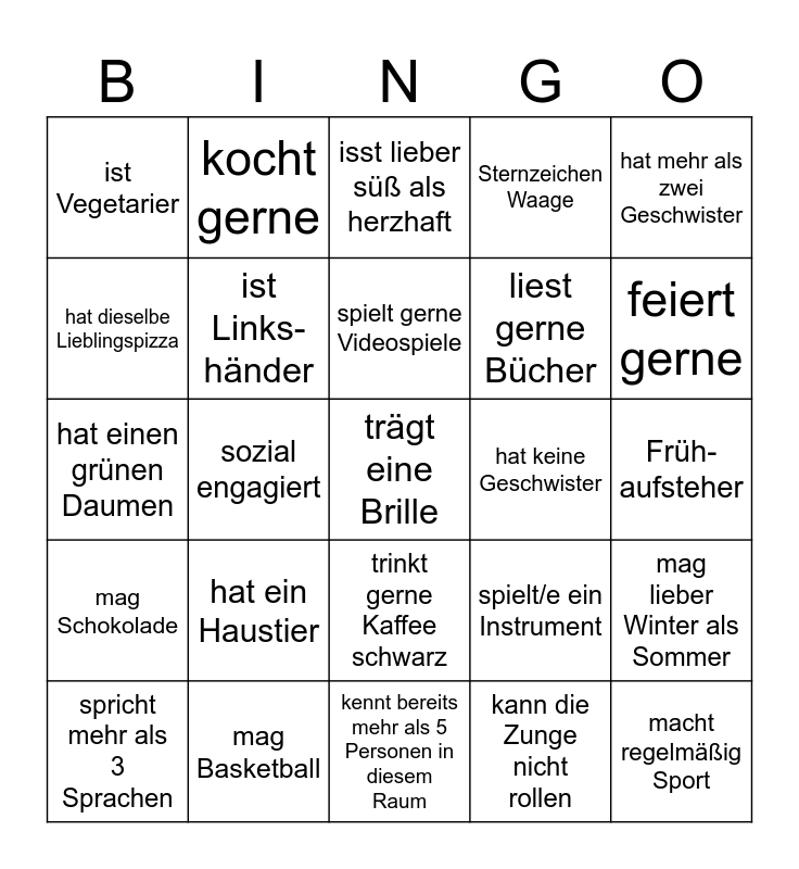 This bingo card has a free space and 24 words: hat ein Haustier, mag Basketball, spielt gerne Videospiele, spricht mehr als 3 Sprachen, hat mehr als zwei Geschwister, ist Vegetarier, hat dieselbe Lieblingspizza, kocht gerne, hat keine Geschwister, trinkt gerne Kaffee schwarz, liest gerne Bücher, hat einen grünen Daumen, spielt/e ein Instrument, mag lieber Winter als Sommer, ist Links-händer, kann die Zunge nicht rollen, Früh-aufsteher, isst lieber süß als herzhaft, feiert gerne, sozial engagiert, macht regelmäßig Sport, mag Schokolade, Sternzeichen Waage and kennt bereits mehr als 5 Personen in diesem Raum.