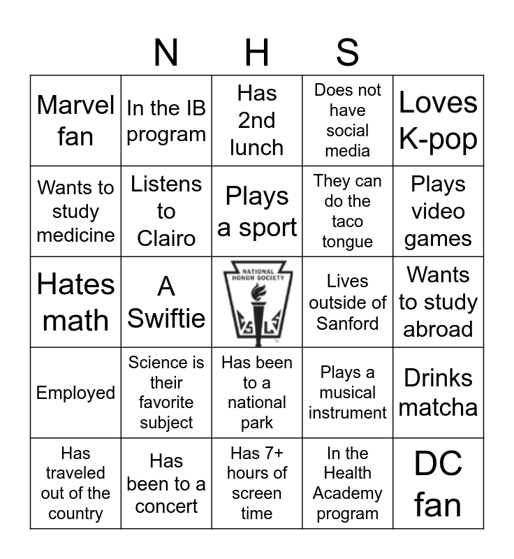 This bingo card has a free space and 24 words: Science is their favorite subject, Has been to a concert, Plays a sport, Has traveled out of the country, Loves K-pop, Marvel fan, Wants to study medicine, In the IB program, Lives outside of Sanford, Has been to a national park, They can do the taco tongue, Hates math, Plays a musical instrument, Drinks matcha, Listens to Clairo, In the Health Academy program, Wants to study abroad, Has 2nd lunch, Plays video games, A Swiftie, DC fan, Employed, Does not have social media and Has 7+ hours of screen time.