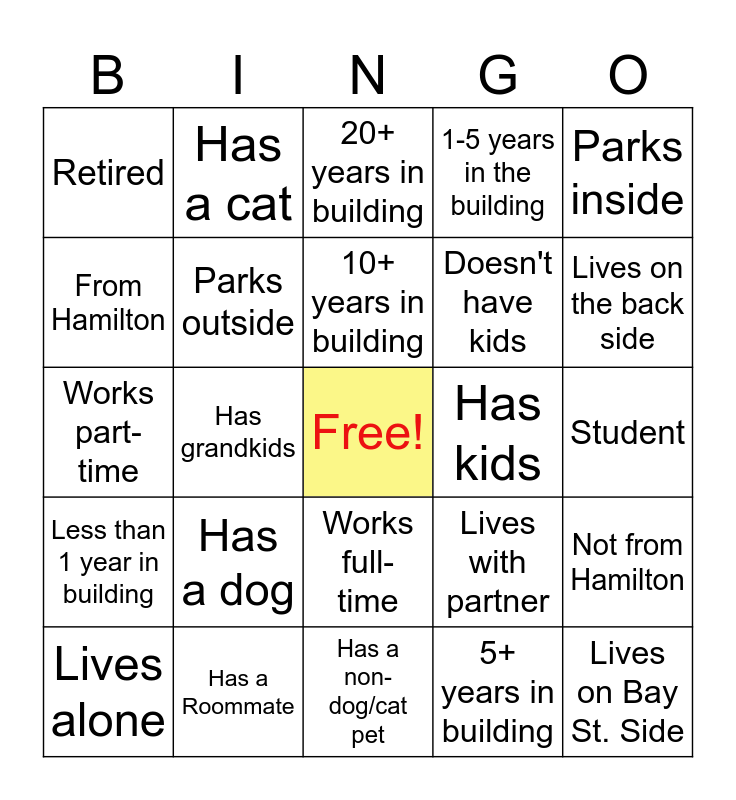 This bingo card has a free space and 24 words: Has a dog, Has a Roommate, 10+ years in building, Lives alone, Parks inside, Retired, From Hamilton, Has a cat, Has kids, Works full-time, Doesn't have kids, Works part-time, Lives with partner, Not from Hamilton, Parks outside, 5+ years in building, Student, 20+ years in building, Lives on the back side, Has grandkids, Lives on Bay St. Side, Less than 1 year in building, 1-5 years in the building and Has a non-dog/cat pet.