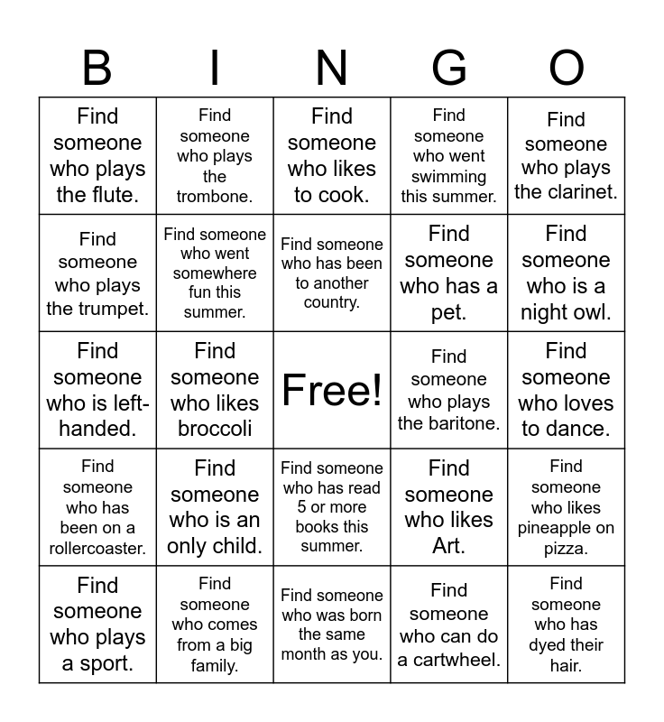 This bingo card has a free space and 24 words: Find someone who is an only child., Find someone who comes from a big family., Find someone who has been to another country., Find someone who plays a sport., Find someone who plays the clarinet., Find someone who plays the flute., Find someone who plays the trumpet., Find someone who plays the trombone., Find someone who plays the baritone., Find someone who has read 5 or more books this summer., Find someone who has a pet., Find someone who is left-handed., Find someone who likes Art., Find someone who likes pineapple on pizza., Find someone who went somewhere fun this summer., Find someone who can do a cartwheel., Find someone who loves to dance., Find someone who likes to cook., Find someone who is a night owl., Find someone who likes broccoli, Find someone who has dyed their hair., Find someone who has been on a rollercoaster., Find someone who went swimming this summer. and Find someone who was born the same month as you..