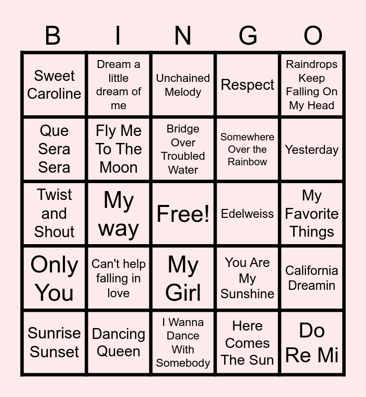 This bingo card has a free space and 24 words: Can't help falling in love, Dancing Queen, Bridge Over Troubled Water, Sunrise Sunset, Raindrops Keep Falling On My Head, Sweet Caroline, Que Sera Sera, Dream a little dream of me, Edelweiss, My Girl, Somewhere Over the Rainbow, Twist and Shout, You Are My Sunshine, California Dreamin, Fly Me To The Moon, Here Comes The Sun, My Favorite Things, Unchained Melody, Yesterday, My way, Do Re Mi, Only You, Respect and I Wanna Dance With Somebody.