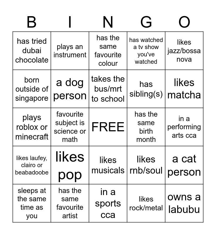This bingo card has a free space and 24 words: likes pop, has the same favourite artist, takes the bus/mrt to school, sleeps at the same time as you, likes jazz/bossa nova, has tried dubai chocolate, born outside of singapore, plays an instrument, has the same birth month, likes musicals, has sibling(s), plays roblox or minecraft, likes rnb/soul, a cat person, a dog person, likes rock/metal, in a performing arts cca, has the same favourite colour, likes matcha, favourite subject is science or math, owns a labubu, likes laufey, clairo or beabadoobe, has watched a tv show you've watched and in a sports cca.