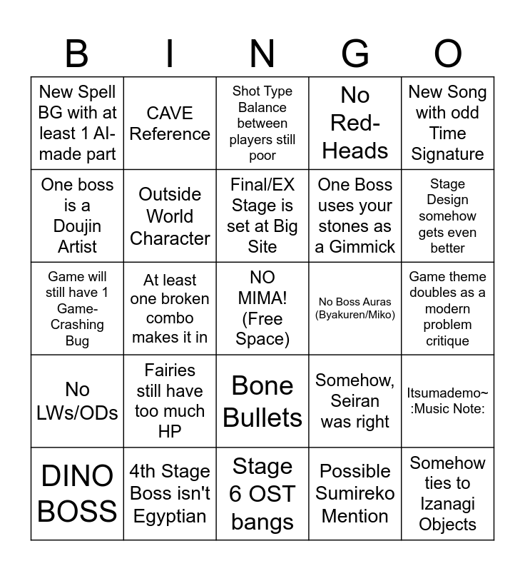 This bingo card has a free space and 24 words: Fairies still have too much HP, 4th Stage Boss isn't Egyptian, Final/EX Stage is set at Big Site, DINO BOSS, New Song with odd Time Signature, New Spell BG with at least 1 AI-made part, One boss is a Doujin Artist, CAVE Reference, No Boss Auras (Byakuren/Miko), Bone Bullets, One Boss uses your stones as a Gimmick, Game will still have 1 Game-Crashing Bug, Somehow, Seiran was right, Itsumademo~ :Music Note:, Outside World Character, Possible Sumireko Mention, Game theme doubles as a modern problem critique, Shot Type Balance between players still poor, Stage Design somehow gets even better, At least one broken combo makes it in, Somehow ties to Izanagi Objects, No LWs/ODs, No Red-Heads and Stage 6 OST bangs.