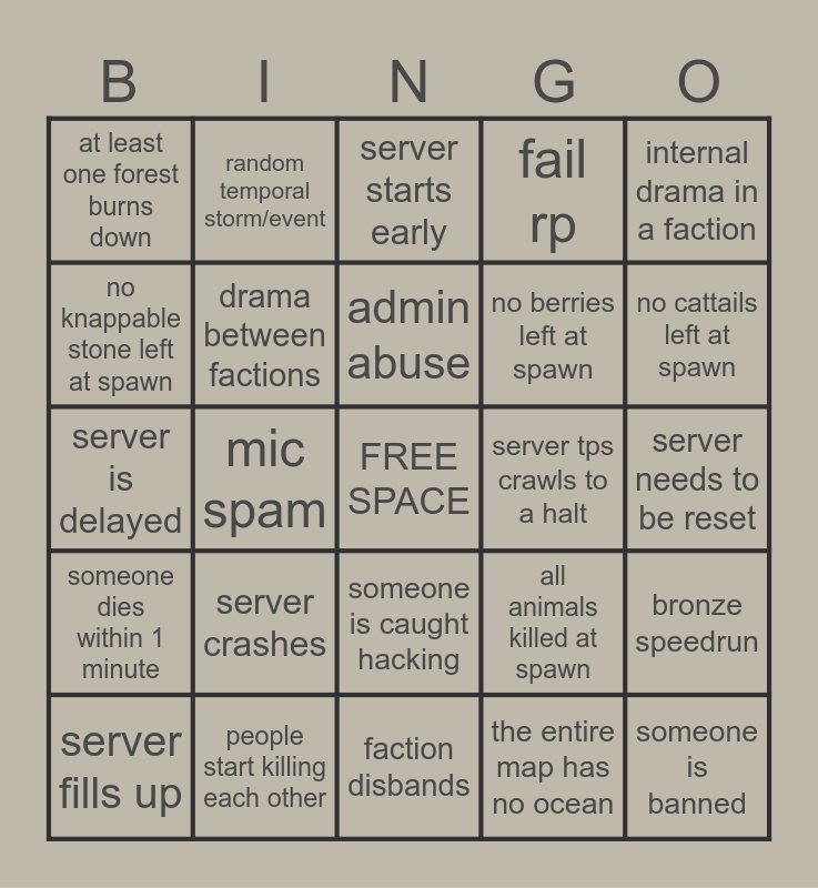 This bingo card has a free space and 24 words: server crashes, people start killing each other, admin abuse, server fills up, internal drama in a faction, at least one forest burns down, no knappable stone left at spawn, random temporal storm/event, server tps crawls to a halt, someone is caught hacking, no berries left at spawn, server is delayed, all animals killed at spawn, bronze speedrun, drama between factions, the entire map has no ocean, server needs to be reset, server starts early, no cattails left at spawn, mic spam, someone is banned, someone dies within 1 minute, fail rp and faction disbands.