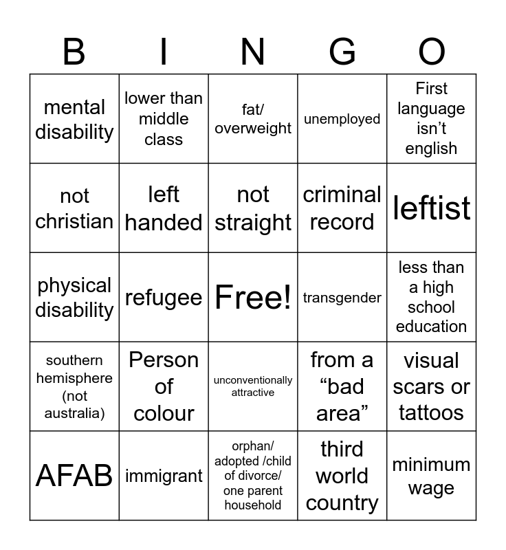 This bingo card has a free space and 24 words: Person of colour, immigrant, not straight, AFAB, First language isn’t english, mental disability, not christian, lower than middle class, transgender, unconventionally attractive, criminal record, physical disability, from a “bad area”, visual scars or tattoos, left handed, third world country, less than a high school education, fat/ overweight, leftist, refugee, minimum wage, southern hemisphere (not australia), unemployed and orphan/ adopted /child of divorce/ one parent household.