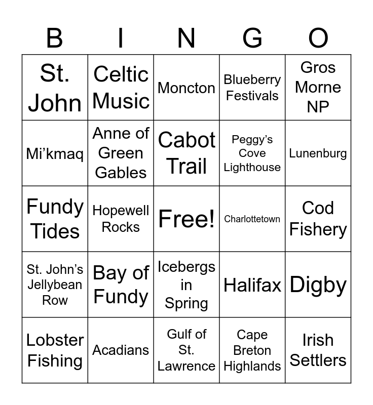 This bingo card has a free space and 24 words: Bay of Fundy, Acadians, Cabot Trail, Lobster Fishing, Gros Morne NP, St. John, Mi’kmaq, Celtic Music, Charlottetown, Icebergs in Spring, Peggy’s Cove Lighthouse, Fundy Tides, Halifax, Digby, Anne of Green Gables, Cape Breton Highlands, Cod Fishery, Moncton, Lunenburg, Hopewell Rocks, Irish Settlers, St. John’s Jellybean Row, Blueberry Festivals and Gulf of St. Lawrence.