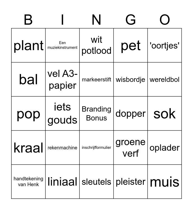 This bingo card has a free space and 34 words: vulpen, pleister, voorleesboek, vaatwasblokje, kraal, vel A3-papier, 'oortjes', handtekening van Henk, Een muziekinstrument, legoblokje, markeerstift, wit potlood, blokje, Atlas, dopper, wereldbol, liniaal, pop, rekenmachine, groene verf, inschrijfformulier, Boom van de 7 gewoonten, plant, sok, sleutels, muis, pet, nietmachine, wisbordje, bal, sticker, iets gouds, oplader and een snoepje.