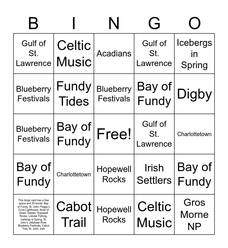 This bingo card has a free space and 29 words: This bingo card has a free space and 29 words: Bay of Fundy, St. John, Peggy’s Cove Lighthouse, Anne of Green Gables, Hopewell Rocks, Lobster Fishing, Icebergs in Spring, St. John’s Jellybean Row, Blueberry Festivals, Cabot Trail, St. John, Irish, Peggy’s Cove Lighthouse, Bay of Fundy, Gros Morne NP, Gulf of St. Lawrence, Acadians, Fundy Tides, Charlottetown, Gulf of St. Lawrence, Cabot Trail, Charlottetown, Gros Morne NP, Hopewell Rocks, Celtic Music, Digby, St. John, Hopewell Rocks, Bay of Fundy, Icebergs in Spring, Blueberry Festivals, Irish Settlers, Celtic Music, Bay of Fundy, Blueberry Festivals, Gulf of St. Lawrence, Celtic Music, Bay of Fundy, Blueberry Festivals and Gulf of St. Lawrence.