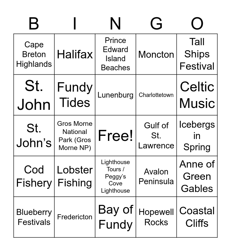 This bingo card has a free space and 31 words: Bay of Fundy, Cabot Trail, Gros Morne National Park (Gros Morne NP), Fundy National Park, Cape Breton Highlands, Prince Edward Island Beaches, Fundy Tides, Avalon Peninsula, Gulf of St. Lawrence, Hopewell Rocks, Icebergs in Spring, Coastal Cliffs, Acadians, Mi’kmaq, Celtic Music, Irish Settlers, Anne of Green Gables, Lobster Fishing, Cod Fishery, Lighthouse Tours / Peggy’s Cove Lighthouse, Tall Ships Festival, St. John’s Jellybean Row, Blueberry Festivals, Halifax, Charlottetown, St. John, Moncton, St. John’s, Fredericton, Lunenburg and Digby.