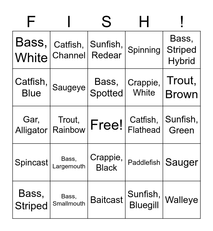 This bingo card has a free space and 24 words: Bass, Largemouth, Bass, Smallmouth, Bass, Spotted, Bass, Striped, Bass, Striped Hybrid, Bass, White, Catfish, Blue, Catfish, Channel, Catfish, Flathead, Crappie, Black, Crappie, White, Gar, Alligator, Paddlefish, Sauger, Saugeye, Sunfish, Bluegill, Sunfish, Green, Sunfish, Redear, Trout, Brown, Trout, Rainbow, Walleye, Spincast, Spinning and Baitcast.