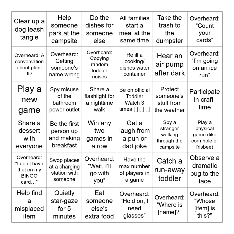 This bingo card has 44 words: Free!, Play a new game, Participate in 2 “does anyone want to play [game name]?” instances [ ] [ ], Win any two games in a row, Have the max number of players in a game, Play a physical game (like corn hole or frisbee), Do the dishes for someone else, Refill the drinking water, Take the trash to the dumpster, Get a laugh from a pun or dad joke, All families start a meal at the same time, Spy misuse of the bathroom power outlet, Participate in craft-time, Protect someone’s stuff from the weather, Eat someone else’s extra food, Spy a stranger walking through the campsite, Observe a dramatic bug to the face, Hear an air pump after dark, Help change a diaper, Refill a cooking/ dishes water container, Help someone park at the campsite, Help find a misplaced item, Catch a run-away toddler, Clear up a dog leash tangle, Try a new food, Share a flashlight for a nighttime walk, Swop places at a charging station with someone, Watch the dog to enable an adventure, Share a dessert with everyone, Be on official Toddler Watch 3 times [ ] [ ] [ ], Roast a food directly with fire and eat it, Be the first person up and making breakfast, Quietly star-gaze for 5 minutes, Overheard: “Hold on, I need glasses”, Overheard: “I’m going on an ice run”, Overheard: “Wait, I’ll go with you”, Overheard: “Where is [name]?”, Overheard: “I don’t have that on my BINGO card…”, Overheard: Getting someone’s name wrong, Overheard: “Count your cards”, Overheard: Copying random toddler noises, Overheard: “Whose [item] is this?”, Overheard: A conversation about plant ID and Overheard: A story about when an adult present was a child.