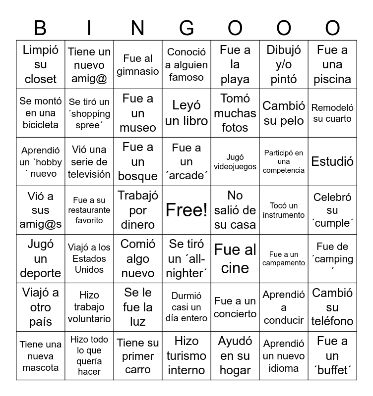 This bingo card has a free space and 48 words: Fue a un concierto, Cambió su pelo, Hizo turismo interno, Fue a su restaurante favorito, Fue a un bosque, Celebró su ´cumple´, Tiene un nuevo amig@, Hizo todo lo que quería hacer, Dibujó y/o pintó, Se tiró un ´all-nighter´, Fue a una piscina, Conoció a alguien famoso, Participó en una competencia, Jugó videojuegos, Viajó a otro país, Tocó un instrumento, Se montó en una bicicleta, Remodeló su cuarto, Aprendió a conducir, Fue a la playa, Tomó muchas fotos, Trabajó por dinero, Limpió su closet, Se tiró un ´shopping spree´, Cambió su teléfono, Fue a un museo, Estudió, Tiene una nueva mascota, Fue a un ´arcade´, Vió una serie de televisión, Aprendió un nuevo idioma, No salió de su casa, Fue de ´camping´, Hizo trabajo voluntario, Vió a sus amig@s, Fue al cine, Fue a un campamento, Aprendió un ´hobby´ nuevo, Comió algo nuevo, Se le fue la luz, Jugó un deporte, Fue a un ´buffet´, Fue al gimnasio, Tiene su primer carro, Leyó un libro, Durmió casi un día entero, Viajó a los Estados Unidos and Ayudó en su hogar.
