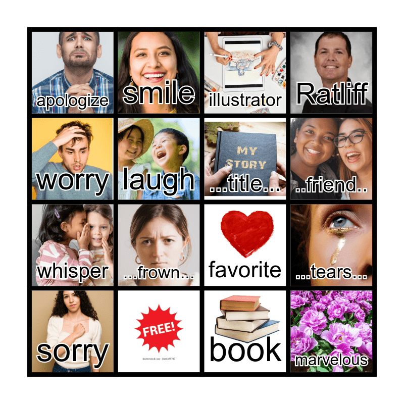 This bingo card has 25 images and 24 words: ...happy..., ...sad..., ..friend.., ..lonely.., worry, apologize, laugh, smile, unique, whisper, favorite, stick, stone, ...title..., author, book, illustrator, ...frown..., ...tears..., sorry, wonder, marvelous, Ratliff and Booth.