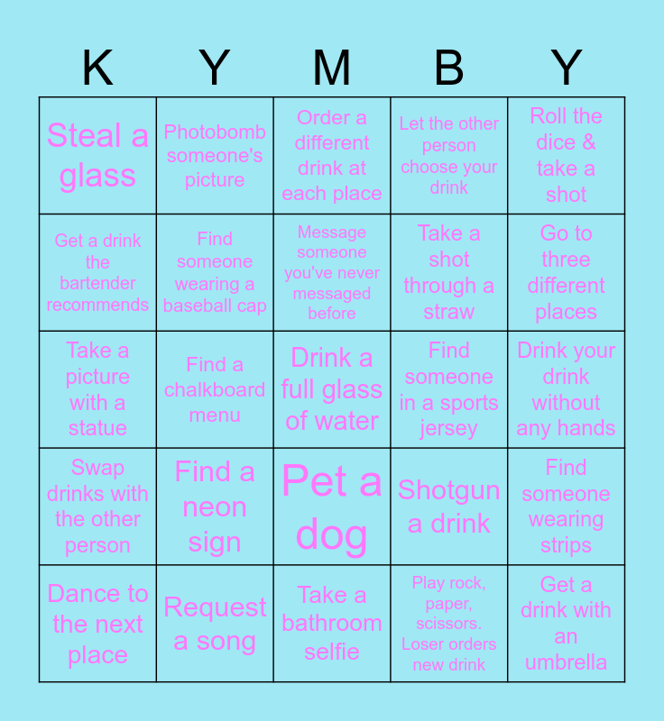 This bingo card has 35 words: Drink a pink drink, Play a bar game, Someone spills their drink, Find someone wearing a baseball cap, Pet a dog, Let the other person choose your drink, Get a drink the bartender recommends, Find someone wearing sunglasses indoors, Message someone you've never messaged before, Find a live music bar, Take a picture with a statue, Roll the dice & take a shot, Take a photo with the bartender, Find the gastown clock & take a pic, Steal a glass, Find someone in a sports jersey, Play rock, paper, scissors. Loser orders new drink, Find a chalkboard menu, Swap drinks with the other person, Drink a full glass of water, Shotgun a drink, Dance to the next place, Find someone wearing strips, Request a song, Order a different drink at each place, Go to three different places, Get a drink with an umbrella, Get a free drink, Take a shot through a straw, Drink your drink without any hands, Order a blue drink, Take a bathroom selfie, Find a neon sign, Photobomb someone's picture and Take a picture on a bridge.
