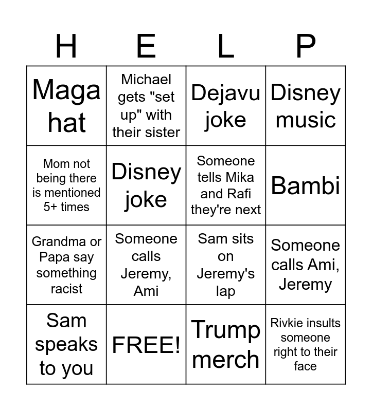 This bingo card has 20 words: Someone calls Ami, Jeremy, Trump comment, Dejavu joke, Joey G lines up a terrible photo, Sam speaks to you, Mom not being there is mentioned 5+ times, FREE!, Maga hat, Grandma or Papa say something racist, Michael gets "set up" with their sister, Someone calls Jeremy, Ami, Sam sits on Jeremy's lap, Disney joke, Rivkie insults someone right to their face, Someone tells Mika and Rafi they're next, The Rivkie pose, Bambi, Disney music, Trump merch and Dad not being there mentioned.