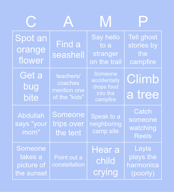 This bingo card has 25 words: Spot a caterpillar, Skip a stone x3, Climb a tree, Spot a cardinal, Get a bug bite, Spot an orange flower, teachers/ coaches mention one of the "kids", Find a seashell, Point out a constellation, Someone catches a fish, Abdullah says "your mom", Speak to a neighboring camp site, Matthew gets shot with a water gun, Find a mushroom, Someone accidentally drops food into the campfire, Spot a chipmunk, Hear a child crying, Say hello to a stranger on the trail, Someone trips over the tent, Catch someone watching Reels, Someone takes a picture of the sunset, Spot a frog, Layla plays the harmonica (poorly), Tell ghost stories by the campfire and Spot animal tracks.