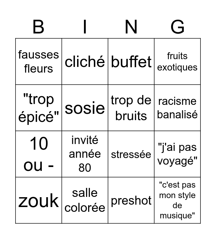 This bingo card has 16 words: salle colorée, "j'ai pas voyagé", buffet, fausses fleurs, 10 ou -, cliché, stressée, preshot, "trop épicé", sosie, zouk, fruits exotiques, invité année 80, racisme banalisé, trop de bruits and "c'est pas mon style de musique".