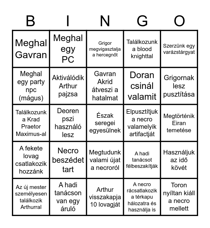 This bingo card has a free space and 24 words: Necro beszédet tart, A hadi tanácson van egy áruló, Gavran Akrid átveszi a hatalmat, Az új mester személyesen találkozik Arthurral, Szerzünk egy varázstárgyat, Meghal Gavran, Meghal egy party npc (mágus), Meghal egy PC, Elpusztítjuk a necro valamelyik artifactját, Megtudunk valami újat a necroról, Doran csinál valamit, Találkozunk a Krad Praetor Maximus-al, A hadi tanácsot félbeszakítják, Használjuk az idő kövét, Aktiválódik Arthur pajzsa, A necro rácsatlakozik a térkapu hálozatra és használja is, Megtörténik Eiran temetése, Grigor megvigasztalja a hercegnőt, Grigornak lesz pusztítása, Deoren pszi használó lesz, Toron nyíltan kiáll a necro mellett, A fekete lovag csatlakozik hozzánk, Találkozunk a blood knighttal and Arthur visszakapja 10 lovagját.