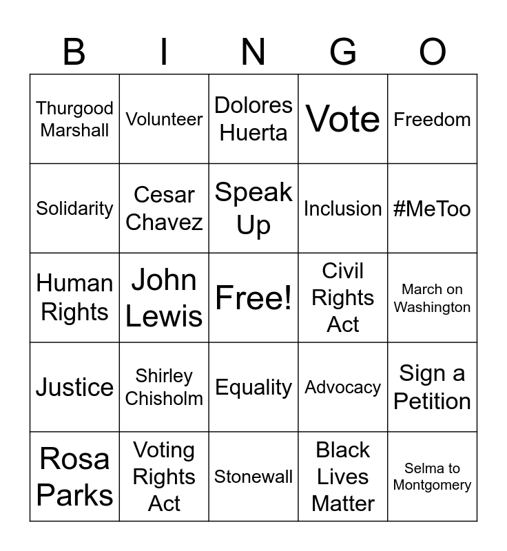 This bingo card has a free space and 29 words: Rosa Parks, Martin Luther King Jr., John Lewis, Malcolm X, Thurgood Marshall, Dolores Huerta, Cesar Chavez, Shirley Chisholm, Civil Rights Act, Voting Rights Act, March on Washington, Selma to Montgomery, Stonewall, Black Lives Matter, #MeToo, Women’s Suffrage, Equality, Justice, Freedom, Human Rights, Advocacy, Protest, Inclusion, Solidarity, Vote, Volunteer, Sign a Petition, Speak Up and Mentor.
