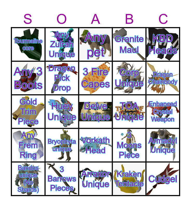 This bingo card has 24 images, a free space and 24 words: Bandos unique (No Shards), Bryophyta unique, 3 Fire Capes, Kraken Tentacle, KBD Heads, Tourmaline core, Any Zulrah Unique, Any pet, TOA Unique, Enhanced Crystal Weapon, Gold Trim Piece, Dragon Pick Drop, 3 Moons Piece, Armadyl Unique, Any 3 Boots, 3 Barrows Pieces, Arraxor Unique, Granite Maul, Dragon Chainbody, Any Frem Ring, Huey Unique, Vorkath Head, Corp Unique and Cudgel.
