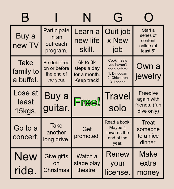 This bingo card has a free space and 24 words: New ride., Take another long drive., 6k to 8k steps a day for a month. Keep track!, Renew your license., Start a series of content online (at least 5), Buy a new TV, Participate in an outreach program., Learn a new life skill., Travel solo, Freedive again with friends. (fun dive only), Lose at least 15kgs., Be debt-free on or before the end of the year., Read a book. Maybe 4 towards the end of the year., Treat someone to a nice dinner., Take family to a buffet., Give gifts on Christmas, Watch a stage play theatre., Quit job x New job, Own a jewelry, Go to a concert., Buy a guitar., Get promoted., Cook meals you haven’t done before: 1. Dinuguan 2. Chicharon 3. Lechon and Make extra money.