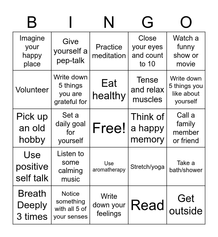This bingo card has a free space and 29 words: Breath Deeply 3 times, Exercise at least 30 minutes a day, Set a daily goal for yourself, Do something creative, Imagine your happy place, Practice meditation, Write down 5 things you are grateful for, Listen to some calming music, Think of a happy memory, Notice something with all 5 of your senses, Call a family member or friend, Get outside, Write down your feelings, Read, Write down 5 things you like about yourself, Make a hot drink, Use aromatherapy, Use positive self talk, Watch a funny show or movie, Pick up an old hobby, Stretch/yoga, Take a nap, Tense and relax muscles, Volunteer, Close your eyes and count to 10, Give yourself a pep-talk, Take a bath/shower, Eat healthy and Schedule time for yourself.