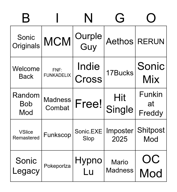 This bingo card has a free space and 24 words: Sonic Legacy, Funkscop, Indie Cross, Mario Madness, RERUN, Sonic Originals, MCM, Ourple Guy, Hit Single, Funkin at Freddy, Random Bob Mod, FNF: FUNKADELIX, Imposter 2025, Shitpost Mod, Welcome Back, Pokeporlza, Hypno Lu, Aethos, Sonic Mix, VSlice Remastered, Madness Combat, Sonic.EXE Slop, 17Bucks and OC Mod.
