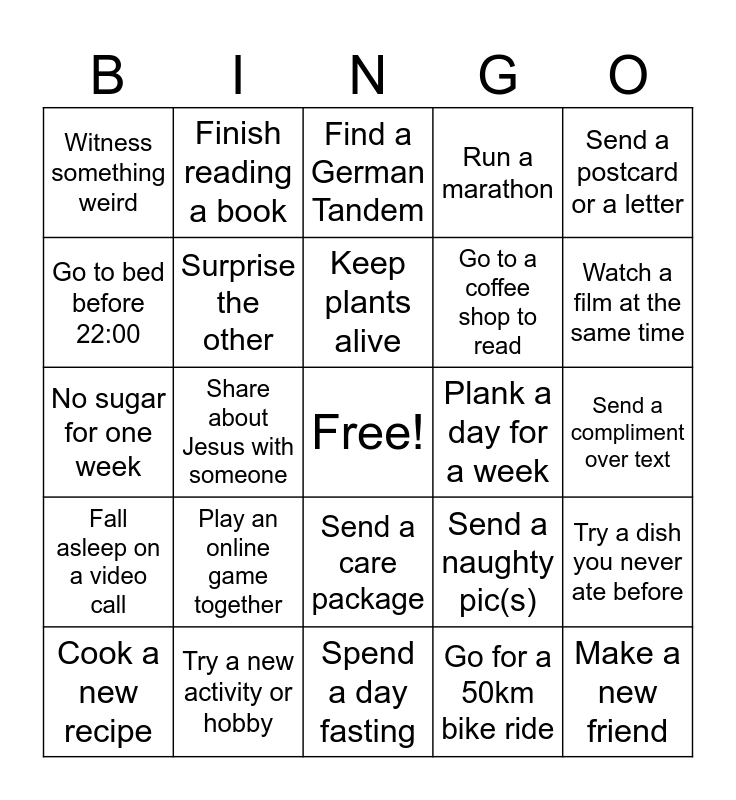 This bingo card has a free space and 24 words: Cook a new recipe, Play an online game together, Keep plants alive, Go for a 50km bike ride, Send a postcard or a letter, Witness something weird, Finish reading a book, Find a German Tandem, Plank a day for a week, Send a compliment over text, No sugar for one week, Surprise the other, Send a naughty pic(s), Try a dish you never ate before, Go to bed before 22:00, Try a new activity or hobby, Spend a day fasting, Run a marathon, Watch a film at the same time, Fall asleep on a video call, Share about Jesus with someone, Send a care package, Go to a coffee shop to read and Make a new friend.