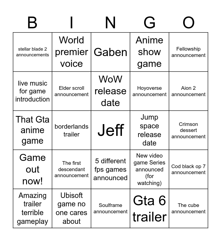 This bingo card has a free space and 24 words: The first descendant announcement, Ubisoft game no one cares about, WoW release date, Amazing trailer terrible gameplay, Fellowship announcement, stellar blade 2 announcements, live music for game introduction, World premier voice, Jump space release date, 5 different fps games announced, Hoyoverse announcement, That Gta anime game, New video game Series announced (for watching), Cod black op 7 announcement, Elder scroll announcement, Gta 6 trailer, Crimson dessert announcement, Gaben, Aion 2 announcement, borderlands trailer, The cube announcement, Game out now!, Anime show game and Soulframe announcement.