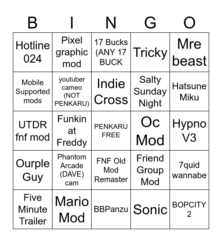 This bingo card has a free space and 25 words: Phantom Arcade (DAVE) cam, BBPanzu, Indie Cross, Five Minute Trailer, Mre beast, Hotline 024, Mobile Supported mods, Pixel graphic mod, Oc Mod, FNF Old Mod Remaster, Salty Sunday Night, UTDR fnf mod, Friend Group Mod, 7quid wannabe, youtuber cameo (NOT PENKARU), HJD, Hypno V3, 17 Bucks (ANY 17 BUCK, Hatsune Miku, Funkin at Freddy, BOPCITY 2, Mario Mod, Ourple Guy, Tricky and Sonic.