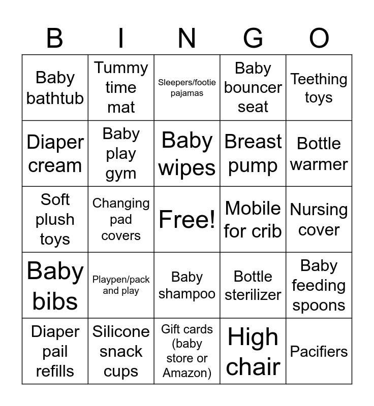 This bingo card has a free space and 75 words: Baby clothes (various sizes), Onesies, Sleepers/footie pajamas, Swaddle blankets, Muslin blankets, Burp cloths, Receiving blankets, Baby socks, Baby mittens, Baby hats, Diaper bag, Diapers (newborn and larger sizes), Baby wipes, Diaper cream, Changing pad, Changing pad covers, Portable changing mat, Pacifiers, Pacifier clips, Teething toys, Rattles, Soft plush toys, Baby play gym, Tummy time mat, Baby bouncer seat, Baby swing, Rocking chair or glider, Baby monitor (audio or video), White noise machine, Humidifier, Nightlight, Sound machine with lullabies, Baby bottles, Bottle sterilizer, Bottle warmer, Breast pump, Breast milk storage bags, Nursing pillow, Nursing cover, High chair, Infant car seat, Car seat mirror, Stroller, Stroller organizer, Baby carrier (wrap or structured), Diaper pail, Diaper pail refills, Baby bathtub, Bath thermometer, Baby towels, Washcloths, Baby shampoo, Baby lotion, Baby nail clippers, Baby brush/comb set, Infant first aid kit, Thermometer, Baby book/memory book, Board books, Soft fabric books, Playpen/pack and play, Portable crib/bassinet, Crib mattress, Crib sheets, Waterproof mattress protectors, Mobile for crib, Baby clothes hangers, Closet dividers (by size), Baby food maker, Baby feeding spoons, Baby bibs, Silicone snack cups, Baby plates and bowls, Gift cards (baby store or Amazon) and Keepsake box for baby memories.