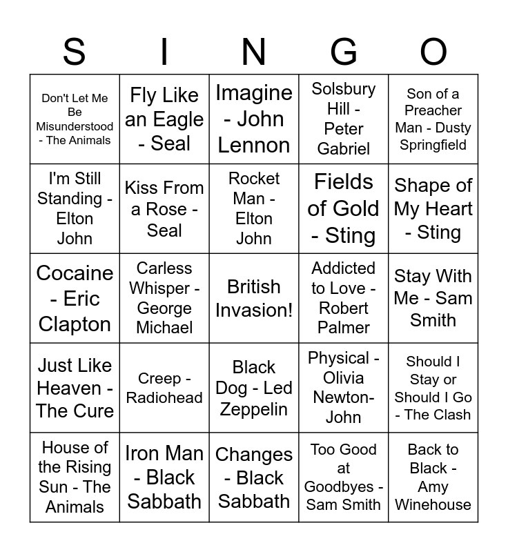 This bingo card has a free space and 76 words: In the Air Tonight - Phil Collins, You'll Be In My Heart - Phil Collins, Imagine - John Lennon, Beautful Boy - John Lennon, Hey Jude - The Beatles, A Hard Day's Night - The Beatles, Let It Be - The Beatles, Help! - The Beatles, Yellow Submarine - The Beatles, Yesterday - The Beatles, Sweet Dreams - Eurythmics, Bennie and the Jets - Elton John, Rocket Man - Elton John, I'm Still Standing - Elton John, Tiny Dancer - Elton John, Carless Whisper - George Michael, Wake Me Up Before You Go-Go - Wham!, Back to Black - Amy Winehouse, Rehab - Amy Winehouse, Son of a Preacher Man - Dusty Springfield, Wonderful Tonight - Eric Clapton, Cocaine - Eric Clapton, Kiss From a Rose - Seal, Fly Like an Eagle - Seal, Solsbury Hill - Peter Gabriel, Alison - Elvis Costello, Wild World - Cat Stevens, Thank You - Dido, Brown Eyed Girl - Van Morrison, It Don't Come Easy - Ringo Starr, My Sweet Lord - George Harrison, Got My Mind Set On You - George Harrison, Hoplessly Devoted to You - Olivia Newton-John, Physical - Olivia Newton-John, Shape of My Heart - Sting, Fields of Gold - Sting, Rebel Yell - Billy Idol, White Wedding - Billy Idol, Stay With Me - Sam Smith, Too Good at Goodbyes - Sam Smith, Levitating - Dua Lipa, Bohemian Rhapsody - Queen, Don't Stop Me Now - Queen, We Will Rock You - Queen, Fat Bottomed Girls - Queen, Unwritten - Natasha Beddingfield, House of the Rising Sun - The Animals, Don't Let Me Be Misunderstood - The Animals, Paint It, Black - The Rolling Stones, Beast of Burden - The Rolling Stones, Satisfaction - The Rolling Stones, Black Dog - Led Zeppelin, Whole Lotta Love - Led Zeppelin, Wish You Were Here - Pink Floyd, Baba O'Riley - The Who, Won't Get Fooled Again - The Who, Maybe I'm Amazed - Paul McCartney, Silly Love Songs - Paul McCartney, Band on the Run - Paul McCartney and Wings, Live and Let Die - Paul McCartney and Wings, Creep - Radiohead, Wonderwall - Oasis, Champagne Supernova - Oasis, Yellow - Coldplay, Viva La Vida - Coldplay, Do I Wanna Know - Arctic Monkeys, Addicted to Love - Robert Palmer, Under Pressure - Queen and David Bowie, Starman - David Bowie, Let's Dance - David Bowie, Should I Stay or Should I Go - The Clash, Just Like Heaven - The Cure, Iron Man - Black Sabbath, Paranoid - Black Sabbath, Changes - Black Sabbath and Sunshine of Your Love - Cream.