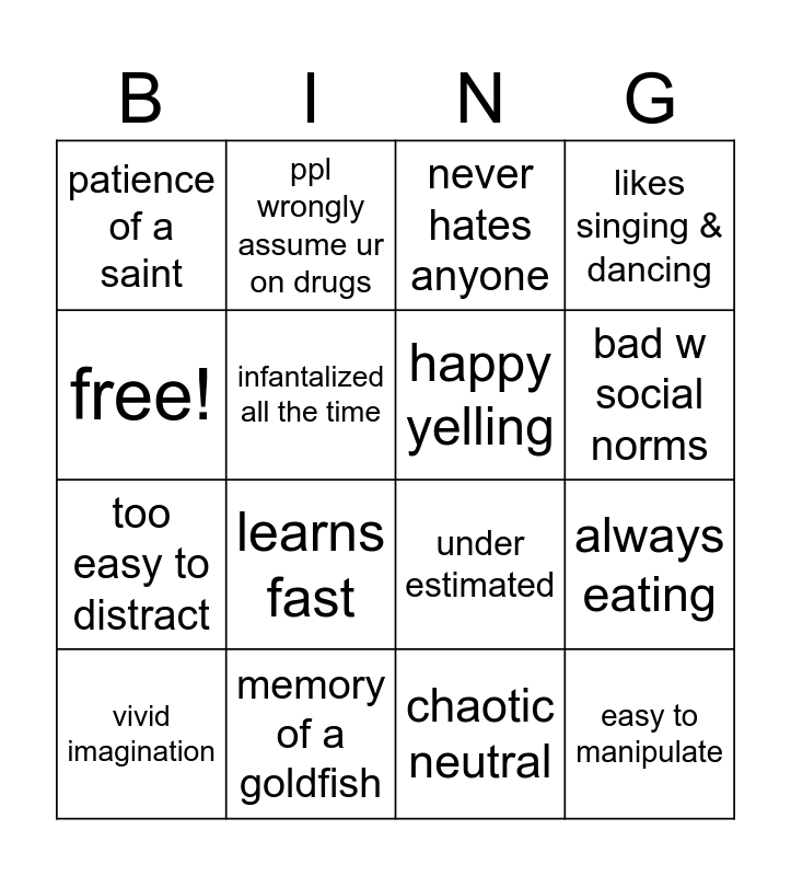This bingo card has 16 words: memory of a goldfish, always eating, never hates anyone, patience of a saint, too easy to distract, ppl wrongly assume ur on drugs, under estimated, chaotic neutral, free!, infantalized all the time, vivid imagination, likes singing & dancing, learns fast, bad w social norms, happy yelling and easy to manipulate.