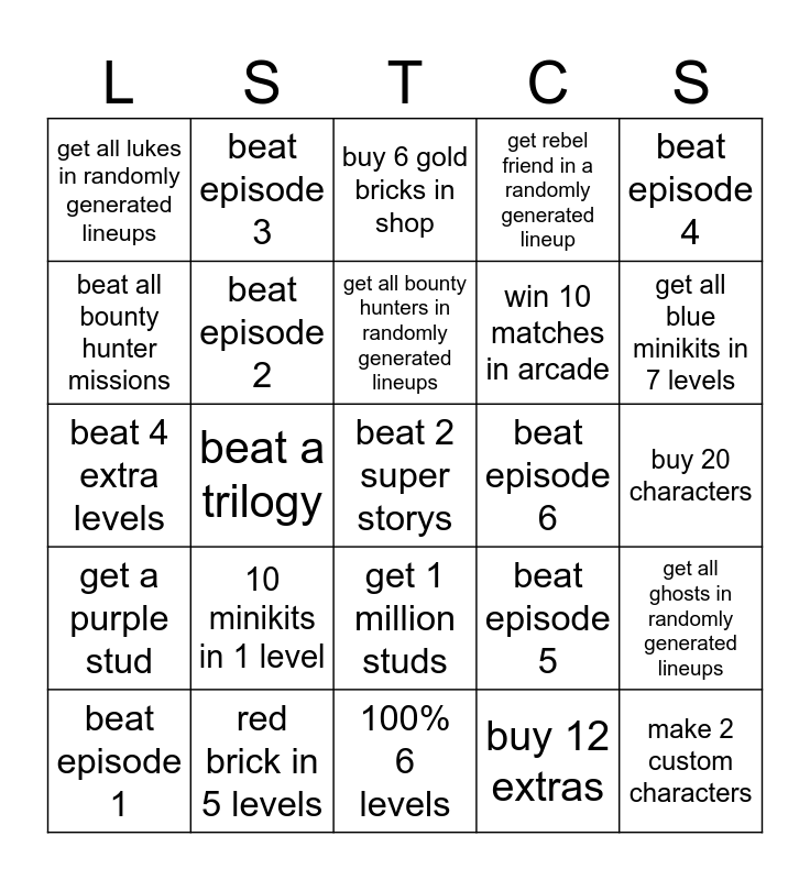 This bingo card has a free space and 24 words: 10 minikits in 1 level, red brick in 5 levels, get all bounty hunters in randomly generated lineups, beat episode 1, beat episode 4, get all lukes in randomly generated lineups, beat all bounty hunter missions, beat episode 3, beat episode 6, get 1 million studs, win 10 matches in arcade, beat 4 extra levels, beat episode 5, get all ghosts in randomly generated lineups, beat episode 2, buy 12 extras, buy 20 characters, buy 6 gold bricks in shop, get all blue minikits in 7 levels, beat a trilogy, make 2 custom characters, get a purple stud, get rebel friend in a randomly generated lineup and 100% 6 levels.