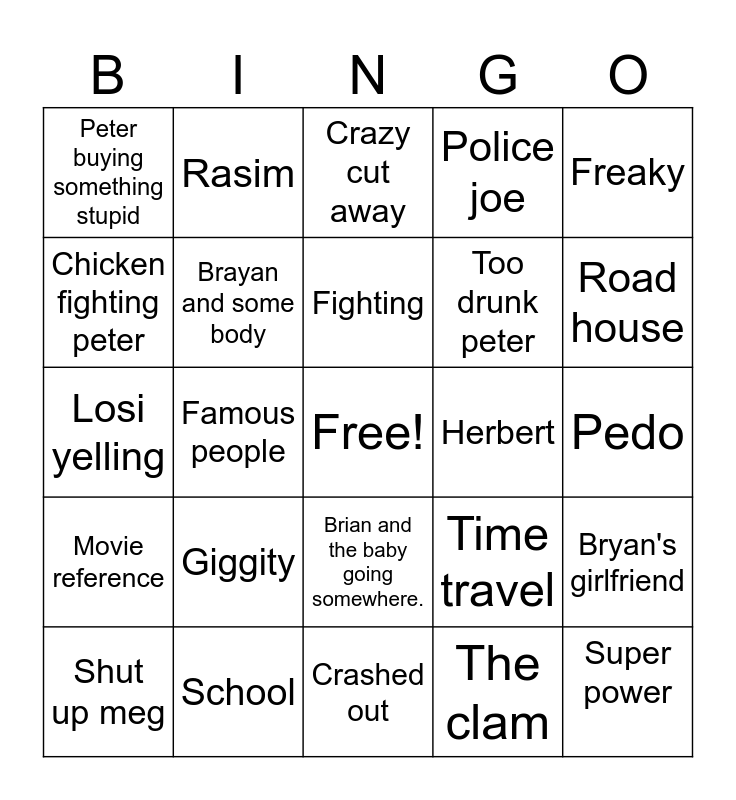 This bingo card has a free space and 24 words: Shut up meg, Giggity, Fighting, The clam, Freaky, Peter buying something stupid, Rasim, Crazy cut away, Herbert, Pedo, Losi yelling, Brayan and some body, Time travel, Bryan's girlfriend, Chicken fighting peter, School, Crashed out, Police joe, Road house, Movie reference, Famous people, Brian and the baby going somewhere., Too drunk peter and Super power.