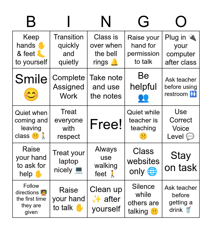 This bingo card has a free space and 29 words: Follow directions 🧑🏫 the first time they are given, Sit still in your black chair 🪑, Treat everyone with respect, Always try your best 💯, Keep hands ✋ & feet 🦶 to yourself, Class is over when the bell rings 🔔, Complete Assigned Work, Treat your laptop nicely 💻, Quiet while teacher is teaching 🤫, Raise your hand to talk ✋, Use Correct Voice Level 💬, Ask teacher before getting a drink 🥤, Clean up ✨ after yourself, Silence while others are talking 🤫, Ask teacher before using restroom 🚻, Push in your chair 🪑, Always use walking feet 🚶, Raise your hand to ask for help ✋, Plug in 🔌 your computer after class, Quiet when coming and leaving class 🤫🚶, Class websites only 🌐, Come prepared for class, Be helpful 👥, Smile 😊, Raise your hand for permission to talk, Transition quickly and quietly, Stay on task, Take note and use the notes and Approved websites only.