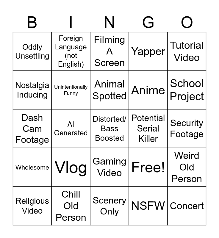 This bingo card has 25 words: Vlog, Scenery Only, Animal Spotted, Religious Video, Tutorial Video, Oddly Unsettling, Nostalgia Inducing, Foreign Language (not English), Potential Serial Killer, Gaming Video, Anime, Dash Cam Footage, Free!, Weird Old Person, Unintentionally Funny, Concert, Security Footage, Filming A Screen, School Project, AI Generated, Distorted/ Bass Boosted, Chill Old Person, Wholesome, Yapper and NSFW.