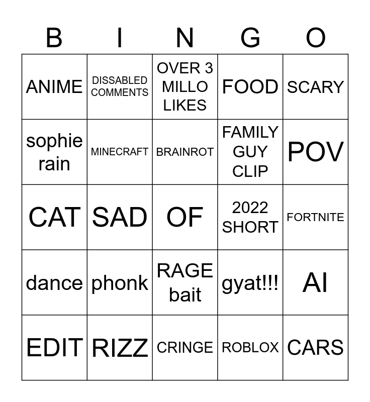 This bingo card has a free space and 24 words: phonk, RIZZ, BRAINROT, EDIT, SCARY, ANIME, sophie rain, DISSABLED COMMENTS, 2022 SHORT, RAGE bait, FAMILY GUY CLIP, CAT, gyat!!!, AI, MINECRAFT, ROBLOX, FORTNITE, OVER 3 MILLO LIKES, POV, SAD, CARS, dance, FOOD and CRINGE.