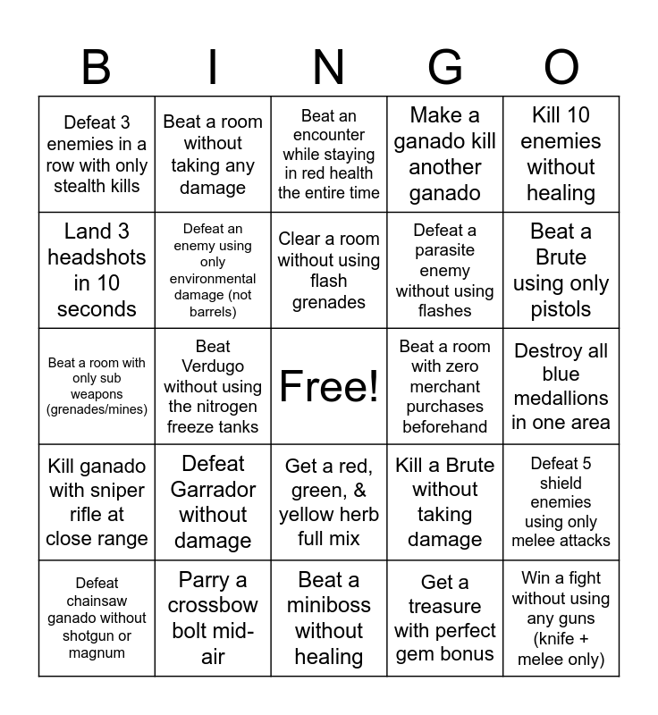 This bingo card has a free space and 24 words: Defeat Garrador without damage, Parry a crossbow bolt mid-air, Clear a room without using flash grenades, Defeat chainsaw ganado without shotgun or magnum, Kill 10 enemies without healing, Defeat 3 enemies in a row with only stealth kills, Land 3 headshots in 10 seconds, Beat a room without taking any damage, Beat a room with zero merchant purchases beforehand, Get a red, green, & yellow herb full mix, Defeat a parasite enemy without using flashes, Beat a room with only sub weapons (grenades/mines), Kill a Brute without taking damage, Defeat 5 shield enemies using only melee attacks, Defeat an enemy using only environmental damage (not barrels), Get a treasure with perfect gem bonus, Destroy all blue medallions in one area, Beat an encounter while staying in red health the entire time, Beat a Brute using only pistols, Beat Verdugo without using the nitrogen freeze tanks, Win a fight without using any guns (knife + melee only), Kill ganado with sniper rifle at close range, Make a ganado kill another ganado and Beat a miniboss without healing.