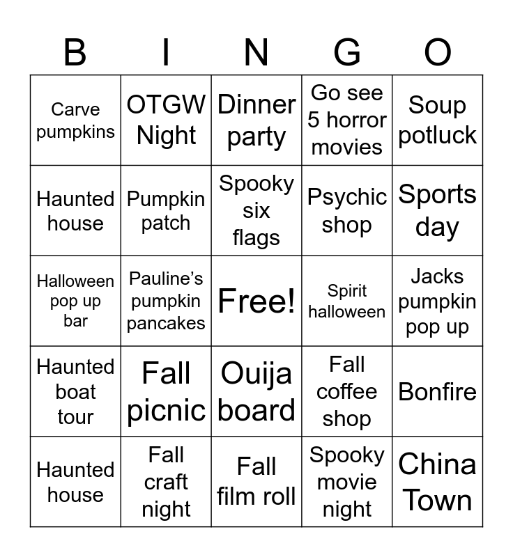 This bingo card has a free space and 24 words: Fall picnic, Fall craft night, Spooky six flags, Haunted house, Soup potluck, Carve pumpkins, Haunted house, OTGW Night, Spirit halloween, Ouija board, Psychic shop, Halloween pop up bar, Fall coffee shop, Bonfire, Pumpkin patch, Spooky movie night, Jacks pumpkin pop up, Dinner party, Sports day, Pauline’s pumpkin pancakes, China Town, Haunted boat tour, Go see 5 horror movies and Fall film roll.