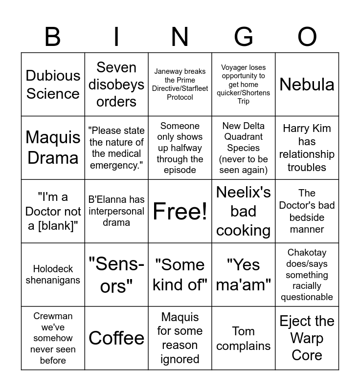 This bingo card has a free space and 24 words: "Sens-ors", Coffee, Someone only shows up halfway through the episode, Crewman we've somehow never seen before, Nebula, Dubious Science, Maquis Drama, Seven disobeys orders, Neelix's bad cooking, "Some kind of", New Delta Quadrant Species (never to be seen again), "I'm a Doctor not a [blank]", "Yes ma'am", Chakotay does/says something racially questionable, "Please state the nature of the medical emergency.", Tom complains, The Doctor's bad bedside manner, Janeway breaks the Prime Directive/Starfleet Protocol, Harry Kim has relationship troubles, B'Elanna has interpersonal drama, Eject the Warp Core, Holodeck shenanigans, Voyager loses opportunity to get home quicker/Shortens Trip and Maquis for some reason ignored.
