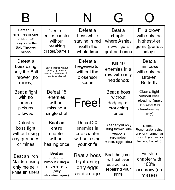 This bingo card has a free space and 25 words: Beat an entire chapter without healing once, Beat a boss fight using only eggs as damage, Defeat a Regenerator without the biosensor scope, Beat an Iron Maiden using only melee + knife finishers, Fill a crown with only the highest-tier gems (perfect inlay), Defeat 10 enemies in one encounter using only the Bolt Thrower mines, Defeat a boss using only the Bolt Thrower (no mines), Clear an entire chapter without breaking crates/barrels, Beat a boss without dodging or crouching once, Defeat 20 enemies in one chapter without using your knife, Kill 10 enemies in a row with only headshots, Beat a fight with no ammo pickups allowed, Clear a fight only using thrown sub-weapons (grenades, mines, eggs, etc.), Defeat a Regenerator using only environmental hazards (explosive barrels, fire, etc.), Beat a chapter without picking up any loot (ammo/resources/pesetas; key items allowed), Kill 5 enemies with back-to-back headshot + melee combos, Clear a fight without ever reloading (must use what’s in chamber/mag only), Defeat a boss while staying in red health the whole time, Beat a miniboss with only the Broken Butterfly, Defeat 15 enemies without missing a single shot, Finish a chapter with 100% accuracy (no misses), Beat an encounter without killing a single enemy (only stuns/escapes), Defeat a boss fight without using any grenades or mines, Beat a chapter where Ashley never gets grabbed once and Beat the game without ever upgrading or repairing your knife.