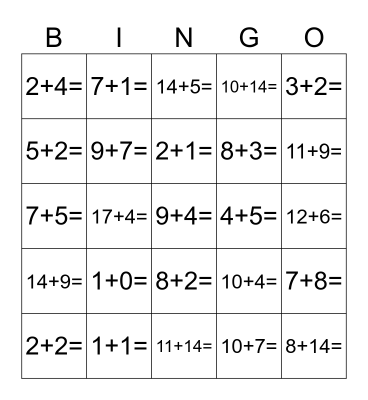 This bingo card has a free space and 24 words: 1+0=, 1+1=, 2+1=, 2+2=, 3+2=, 2+4=, 5+2=, 7+1=, 4+5=, 8+2=, 8+3=, 7+5=, 10+4=, 7+8=, 9+7=, 10+7=, 12+6=, 14+5=, 11+9=, 17+4=, 8+14=, 14+9=, 10+14= and 11+14=.