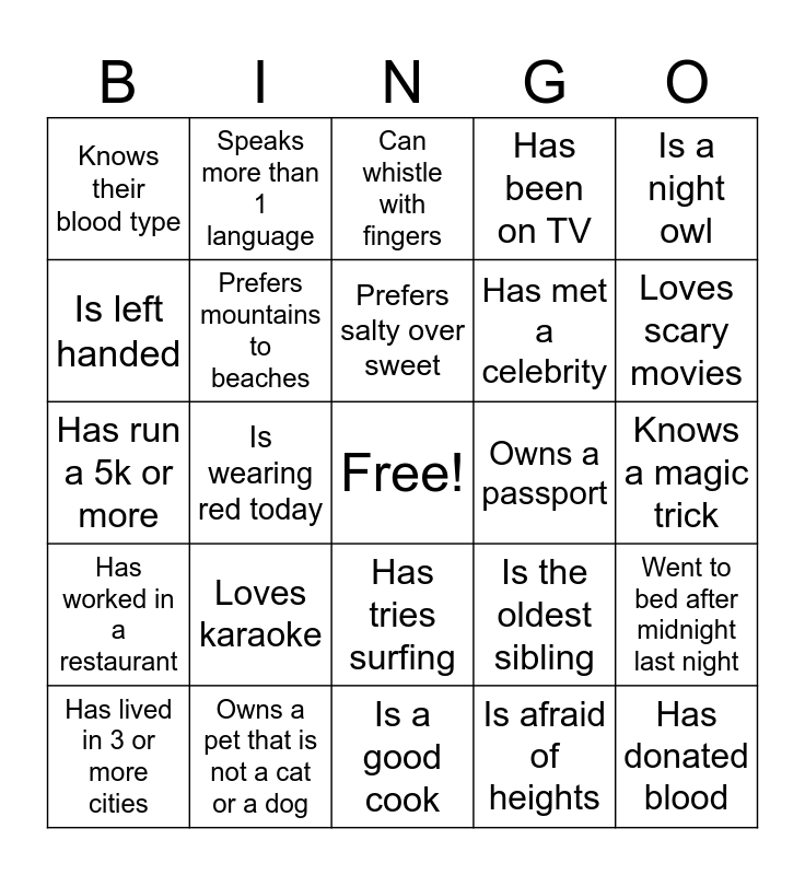 This bingo card has a free space and 30 words: Owns a pet that is not a cat or a dog, Knows how to play chess, Is wearing red today, Has been scuba diving or snorkeling, Knows their blood type, Can whistle with fingers, Prefers mountains to beaches, Has tries surfing, Owns a passport, Is a good cook, Knows a magic trick, Has donated blood, Is afraid of heights, Christmas is not their favorite holiday, Loves scary movies, Hates rollercoasters, Is the oldest sibling, Has worked in a restaurant, Loves karaoke, Is a night owl, Has run a 5k or more, Can't whistle, Speaks more than 1 language, Has met a celebrity, Is left handed, Has been on TV, Went to bed after midnight last night, Has lived in 3 or more cities, Prefers salty over sweet and Can play a musical instrument.